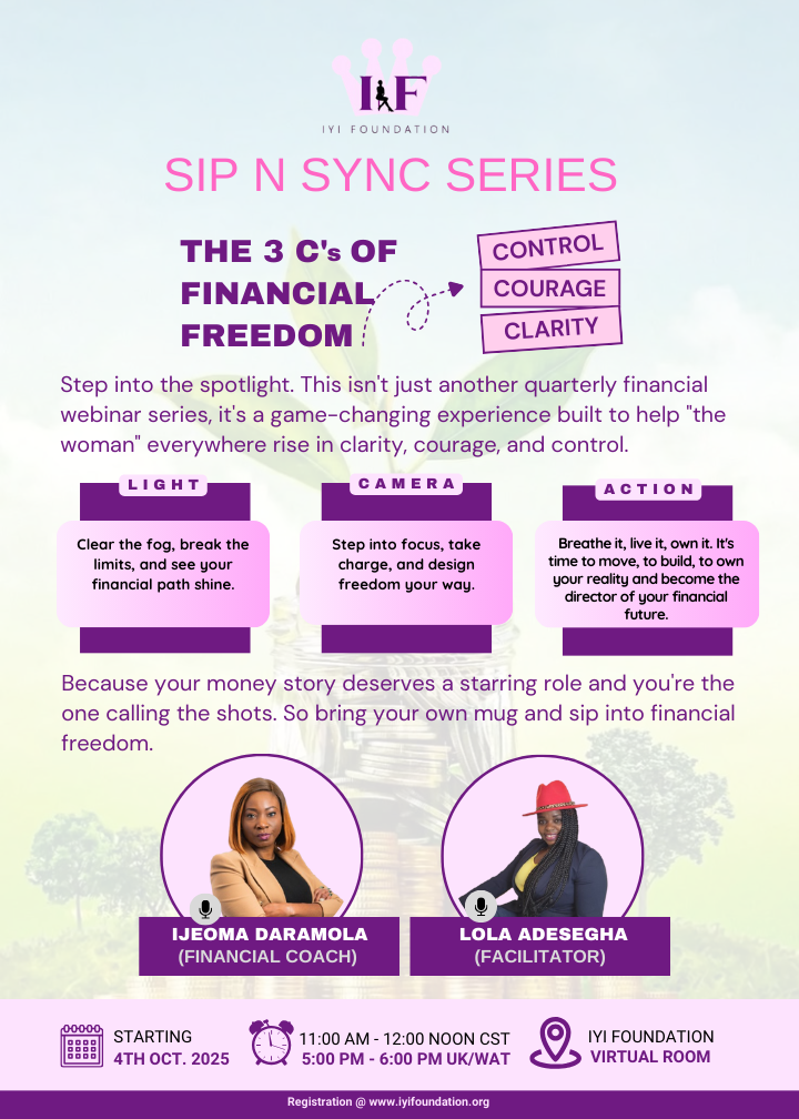 Join the Iyi Foundation for our next Sip & Sync virtual event, a dynamic and hands-on experience designed to equip you with the essential skills for financial leadership and independence.